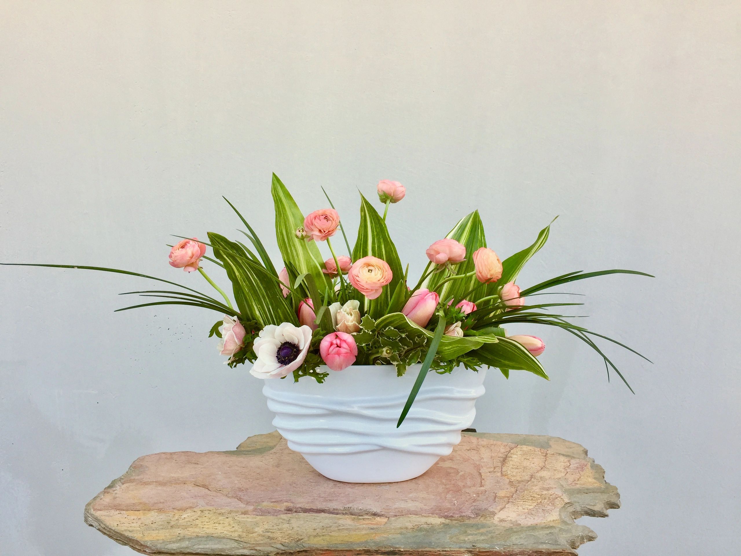 We love sharing and teaching you techniques to do it yourself. Hands-on workshops held at our studio in Mountain View have included technique classes such as the asymmetrical centerpiece on the left, designed by one of our students.